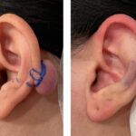 切開法では余剰皮膚を考慮して、紡錘形の切開ラインをデザインします。丸く切るとdogearと言うものが術後に出来てしまい、切開部位の両端に犬の耳のような盛り上がりが出来てしまいます。