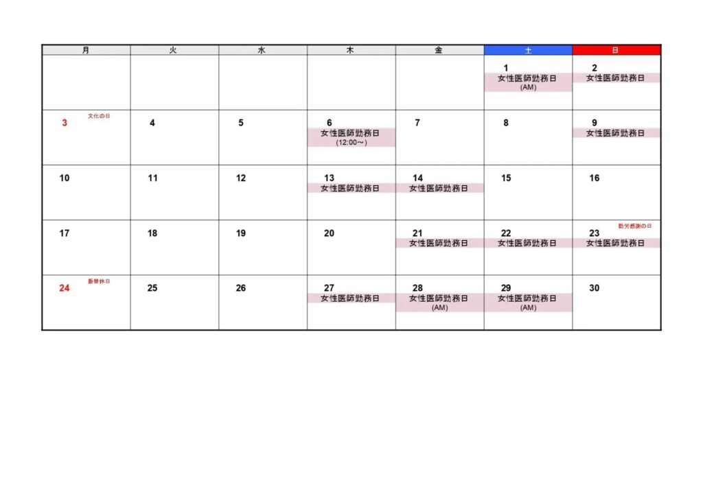 2025年11月 医師出勤日/休診日のお知らせ